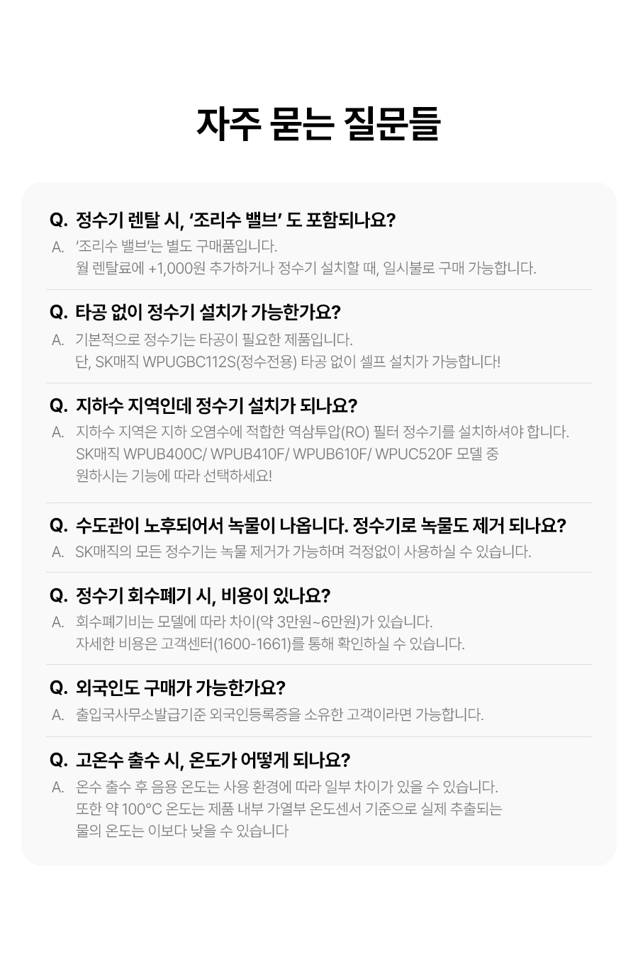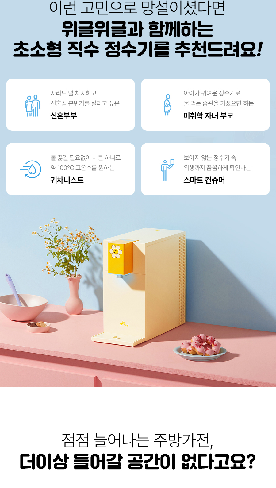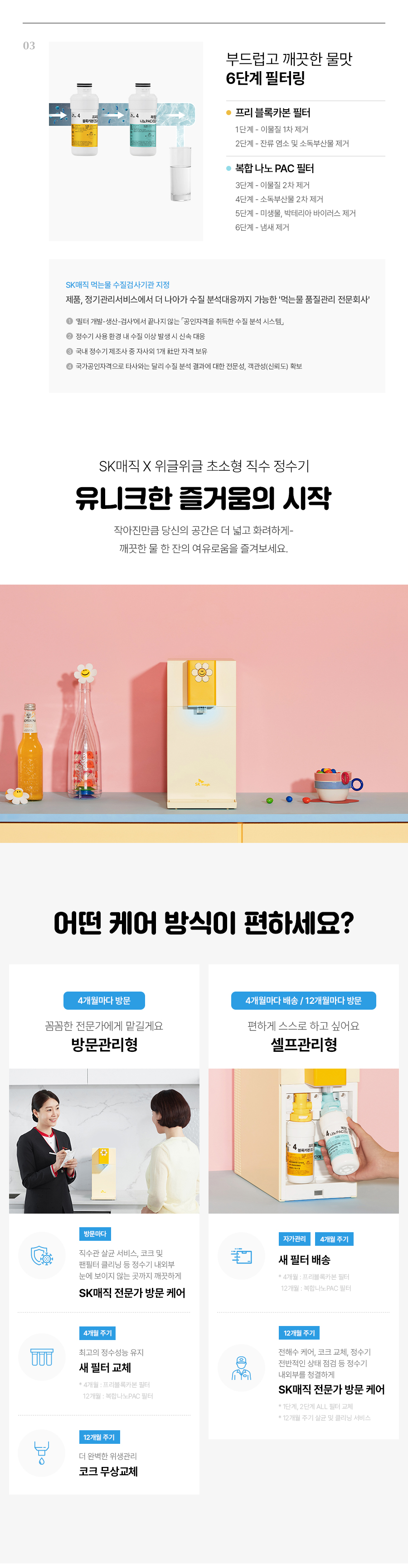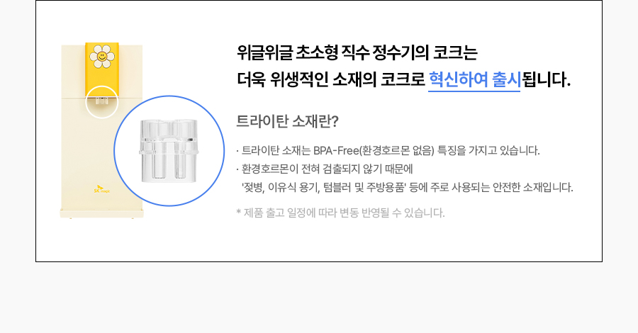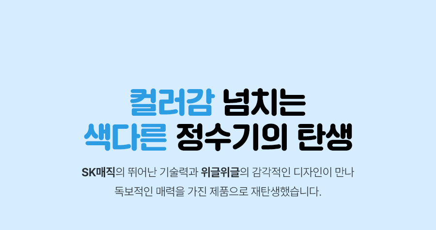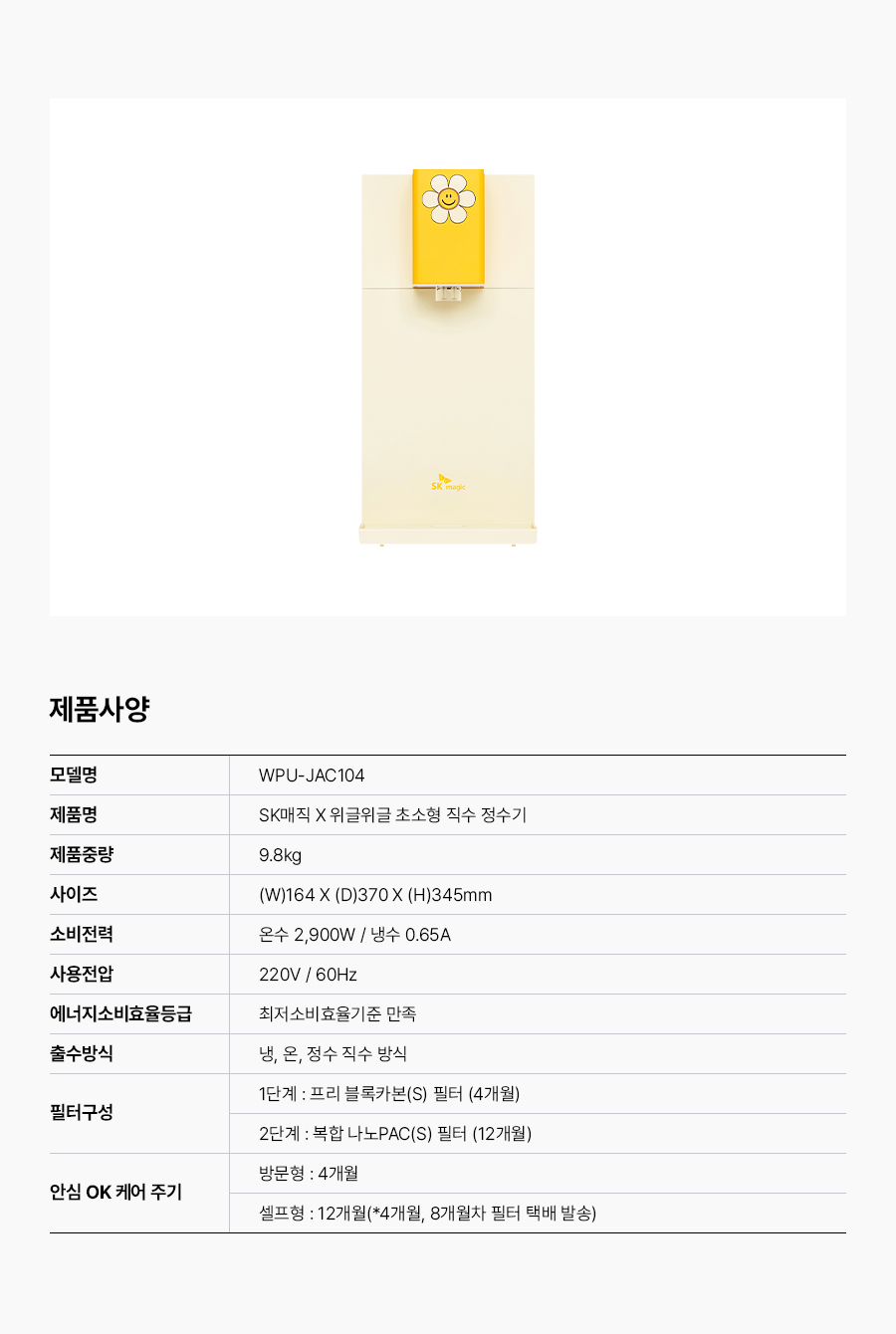 WPU-JAC104S(WW) SK매직 [SK매직] 초소형 직수 정수기 위글위글 제품분류 정수기 정수방식 직수형 기능 냉온전용 AS기간 렌탈기간내 최저 렌탈가 월 27,400 (렌탈가) 제휴카드 할인가 월 (렌탈가) 3년 5년 6년 7년 셀프관리 방문관리/4개월 제품색상 선택 위글 옐로우 + 0원 할인 제휴카드 보기 렌탈신청 장바구니