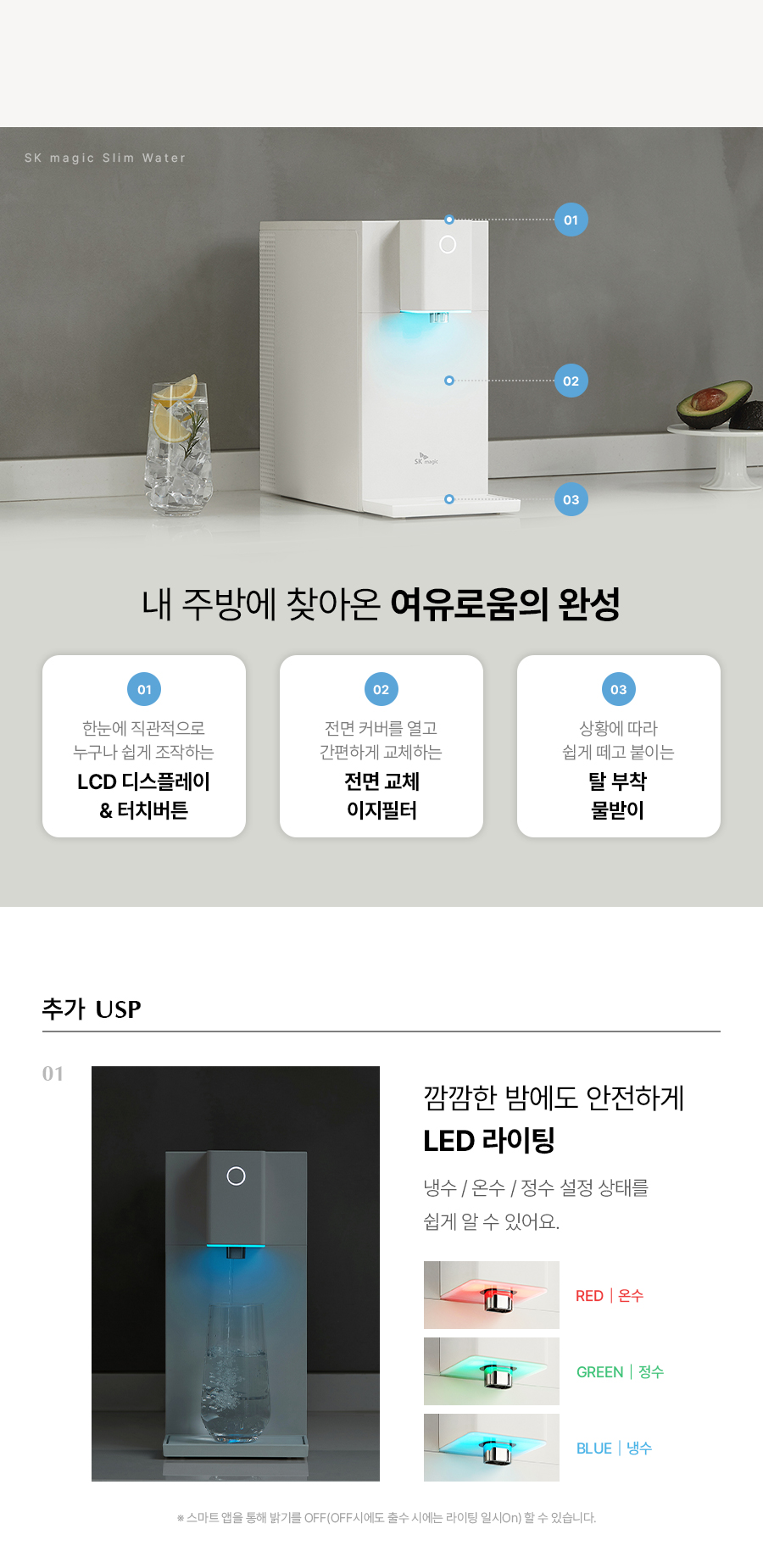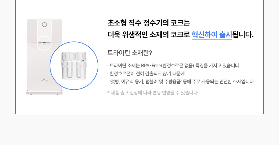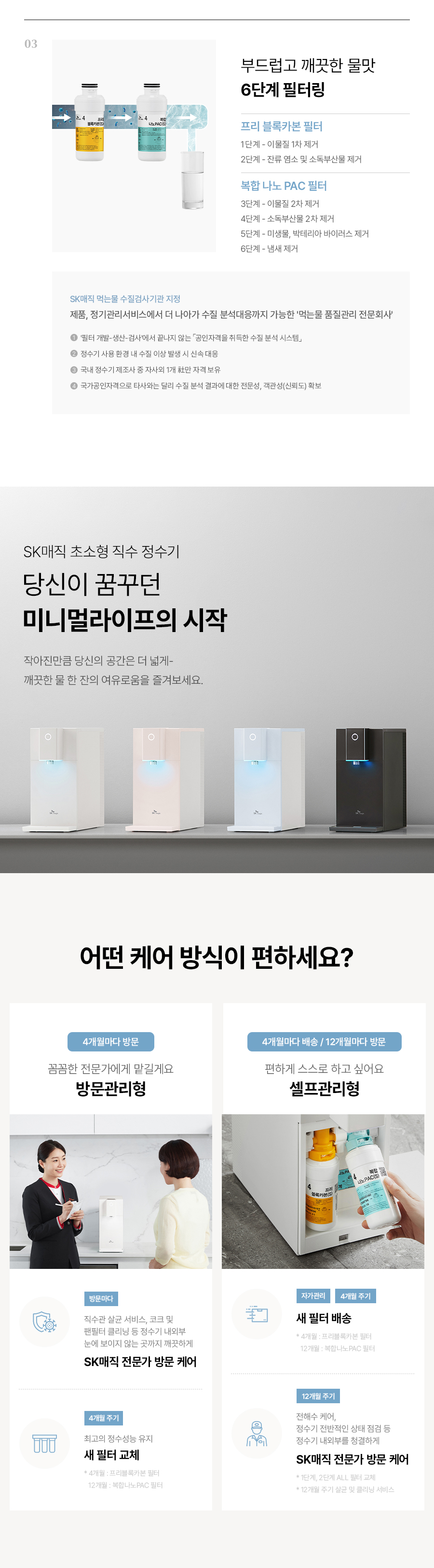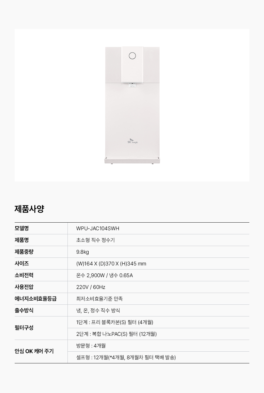 WPU-JAC104S SK매직 [SK매직] 초소형 직수 정수기 제품분류 정수기 정수방식 직수형 기능 냉온전용 AS기간 렌탈기간내 최저 렌탈가 월 27,400 (렌탈가) 제휴카드 할인가 월 (렌탈가) 3년 5년 6년 7년 셀프관리 방문관리/4개월 제품색상 선택 화이트 + 0원 핑크 + 0원 블루 + 0원 다크그레이 + 0원 할인 제휴카드 보기 렌탈신청 장바구니