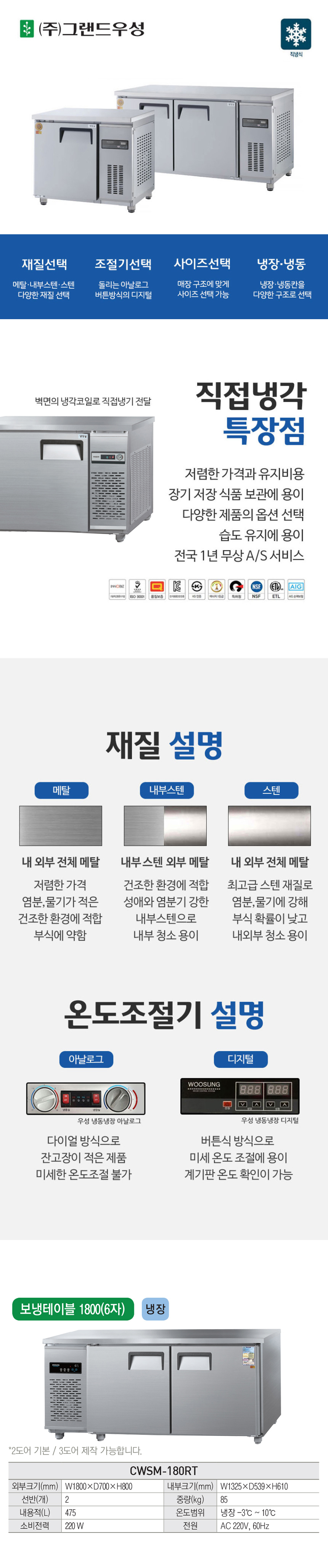 CWSM-180RT_내부스텐 유버스 [그랜드우성] 직냉식 테이블 냉장고 475L 내부스텐 제품분류 업소용 용량(총량) 400L이상 기능 2도어 AS기간 1년 최저 렌탈가 월 43,600 (렌탈가) 제휴카드 할인가 월 (렌탈가) 3년 4년 5년 할인 제휴카드 보기 렌탈신청 장바구니
