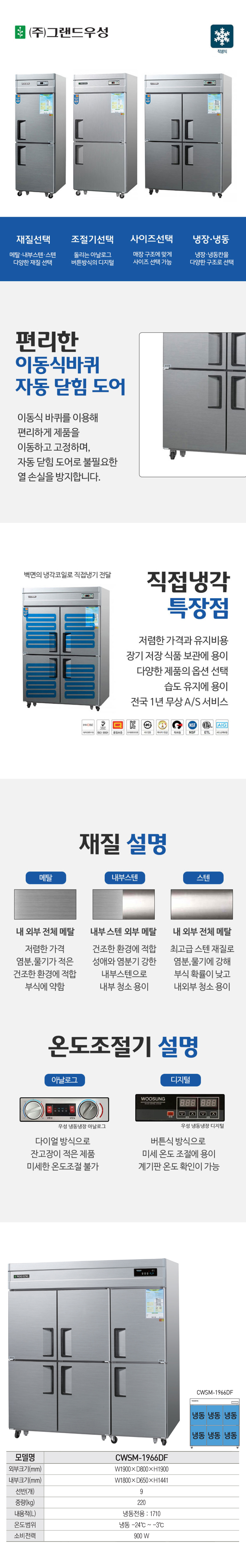 CWSM-1966DF_내부스텐 유버스 [그랜드우성] 직냉식 냉동고 1710L 내부스텐 제품분류 업소용 용량(총량) 1000L이상 기능 6도어 AS기간 1년 최저 렌탈가 월 97,200 (렌탈가) 제휴카드 할인가 월 (렌탈가) 3년 4년 5년 할인 제휴카드 보기 렌탈신청 장바구니