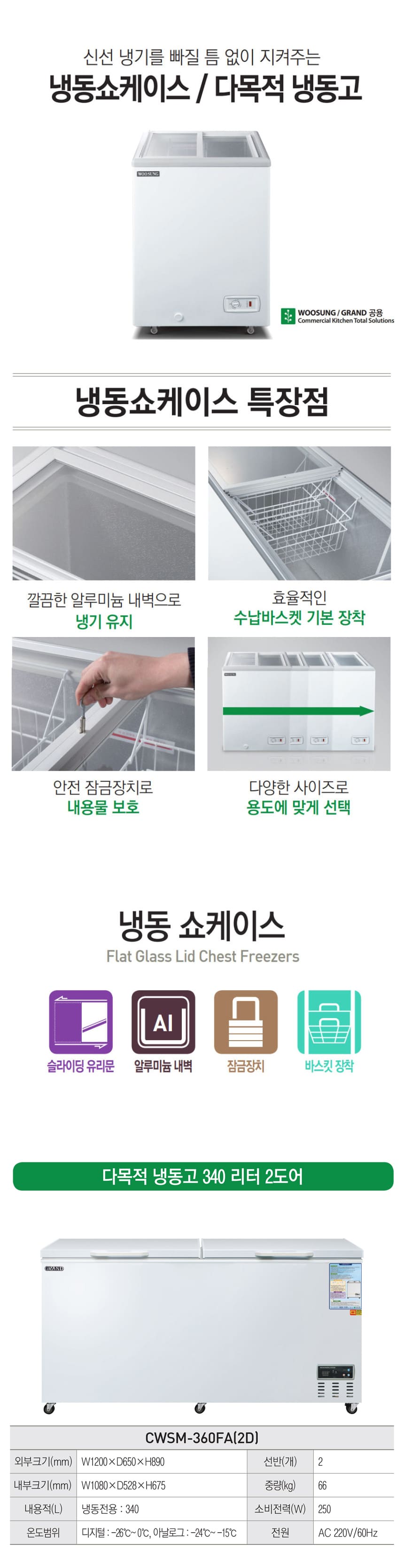 CWSM-360FA(2D) 유버스 [그랜드우성] 다목적 2도어 냉동 쇼케이스 340L 제품분류 업소용 용량(총량) 300L이상 기능 뚜껑형,2도어 AS기간 1년 최저 렌탈가 월 46,700 (렌탈가) 제휴카드 할인가 월 (렌탈가) 3년 4년 5년 할인 제휴카드 보기 렌탈신청 장바구니