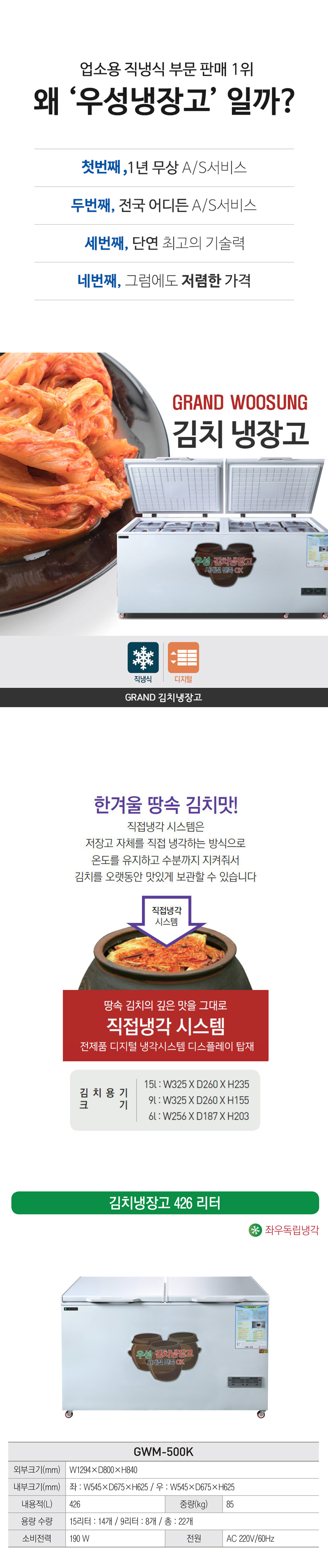GWM-500K 유버스 [그랜드우성] 김치 냉장고 426L 제품분류 업소용 용량(총량) 400L이상 기능 뚜껑형,2도어 AS기간 1년 최저 렌탈가 월 69,100 (렌탈가) 제휴카드 할인가 월 (렌탈가) 3년 4년 5년 할인 제휴카드 보기 렌탈신청 장바구니