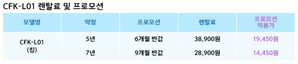 CFK-L01 코웨이 [코웨이] 단매트리스 프레임 킹 제품분류 침대 AS기간 렌탈기간내 최저 렌탈가 월 28,900 (렌탈가) 제휴카드 할인가 월 (렌탈가) 5년 7년 킹 할인 제휴카드 보기 렌탈신청 장바구니