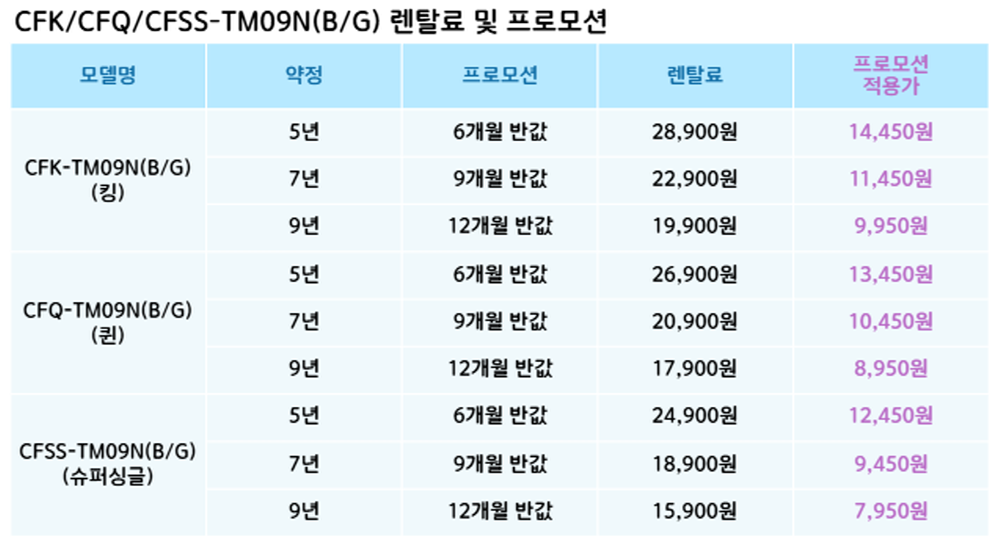 CFSS-TM09N,CFQ-TM09N,CFK-TM09N 코웨이 [코웨이] 투매트리스 프레임 내추럴오크 (슈퍼싱글,퀸,킹) 제품분류 침대 AS기간 렌탈기간내 최저 렌탈가 월 15,900 (렌탈가) 제휴카드 할인가 월 (렌탈가) 5년 7년 9년 슈퍼싱글 퀸 킹 제품색상 선택 그레이 + 0원 다크브라운 + 0원 할인 제휴카드 보기 렌탈신청 장바구니