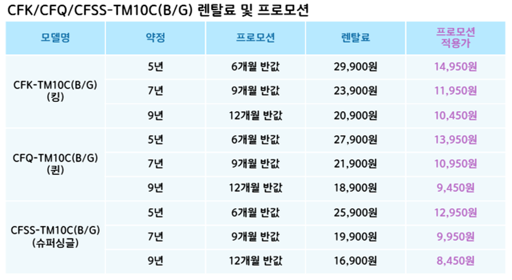 CFSS-TM10C,CFQ-TM10C,CFK-TM10C 코웨이 [코웨이] 투매트리스 프레임 쿠션헤드 크림 (슈퍼싱글,퀸,킹) 제품분류 침대 AS기간 렌탈기간내 최저 렌탈가 월 16,900 (렌탈가) 제휴카드 할인가 월 (렌탈가) 5년 7년 9년 슈퍼싱글 퀸 킹 제품색상 선택 그레이 + 0원 다크브라운 + 0원 할인 제휴카드 보기 렌탈신청 장바구니
