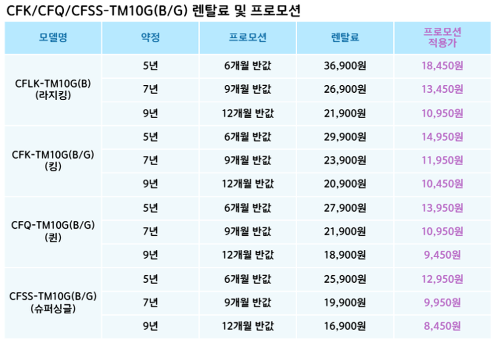 CFSS-TM10G,CFQ-TM10G,CFK-TM10G,CFLK-TM10G 코웨이 [코웨이] 투매트리스 프레임 쿠션헤드 그레이 (슈퍼싱글,퀸,킹,라지킹) 제품분류 침대 AS기간 렌탈기간내 최저 렌탈가 월 16,900 (렌탈가) 제휴카드 할인가 월 (렌탈가) 5년 7년 9년 슈퍼싱글 퀸 킹 라지킹 제품색상 선택 그레이 + 0원 다크브라운 + 0원 할인 제휴카드 보기 렌탈신청 장바구니