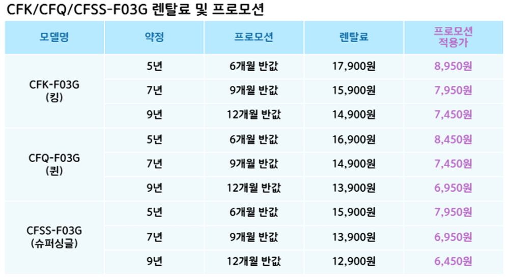 CFSS-F03G,CFQ-F03G,CFK-F03G 코웨이 [코웨이] 파운데이션 그레이 (슈퍼싱글,퀸,킹) 제품분류 침대 AS기간 렌탈기간내 최저 렌탈가 월 12,900 (렌탈가) 제휴카드 할인가 월 (렌탈가) 5년 7년 9년 슈퍼싱글 퀸 킹 할인 제휴카드 보기 렌탈신청 장바구니