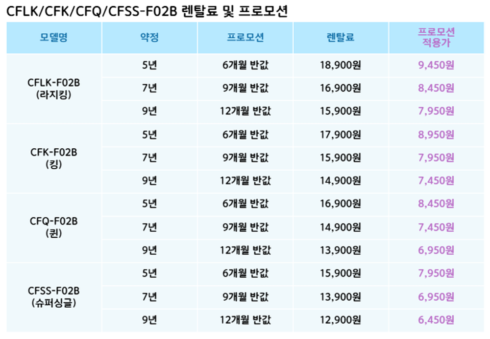 CFSS-F02B,CFQ-F02B,CFK-F02B,CFLK-F02B 코웨이 [코웨이] 파운데이션 브라운 (슈퍼싱글,퀸,킹,라지킹) 제품분류 침대 AS기간 렌탈기간내 최저 렌탈가 월 12,900 (렌탈가) 제휴카드 할인가 월 (렌탈가) 5년 7년 9년 슈퍼싱글 퀸 킹 라지킹 할인 제휴카드 보기 렌탈신청 장바구니
