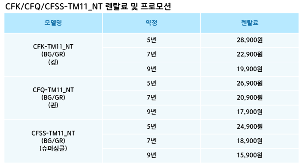 CFSS-TM11_NT,CFQ-TM11_NT,CFK-TM11_NT 코웨이 [코웨이] 비렉스 우디프레임 네츄럴오크 (슈퍼싱글,퀸,킹) 제품분류 침대 AS기간 렌탈기간내 최저 렌탈가 월 15,900 (렌탈가) 제휴카드 할인가 월 (렌탈가) 5년 7년 9년 슈퍼싱글 퀸 킹 파운데이션 선택 오트밀베이지 + 0원 차콜그레이 + 0원 할인 제휴카드 보기 렌탈신청 장바구니