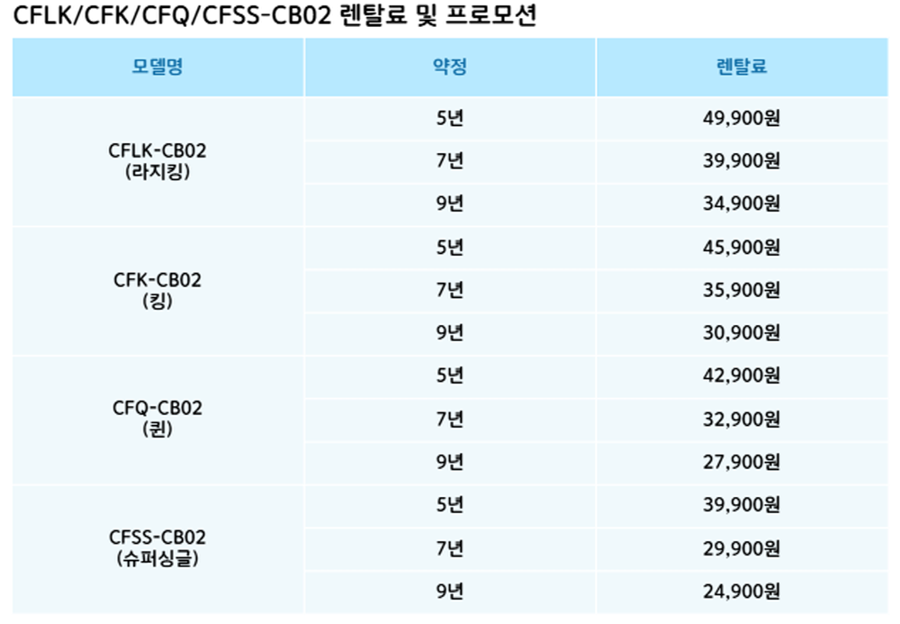 CFSS-CB02,CFQ-CB02,CFK-CB02,CFLK-CB02 코웨이 [코웨이] 비렉스 모던 라운드 프레임 (슈퍼싱글,퀸,킹,라지킹) 제품분류 침대 AS기간 렌탈기간내 최저 렌탈가 월 24,900 (렌탈가) 제휴카드 할인가 월 (렌탈가) 5년 7년 9년 슈퍼싱글 퀸 킹 라지킹 제품색상 선택 오트베이지 + 0원 딥블루 + 0원 카키브라운 + 0원 할인 제휴카드 보기 렌탈신청 장바구니
