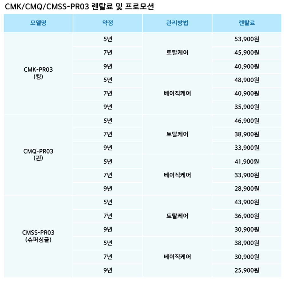 CMSS-PR03,CMQ-PR03,CMK-PR03 코웨이 [코웨이] 탑퍼교체 하이브리드3 매트리스 (슈퍼싱글,퀸,킹) 제품분류 매트리스 AS기간 렌탈기간내 최저 렌탈가 월 25,900 (렌탈가) 제휴카드 할인가 월 (렌탈가) 5년 7년 9년 슈퍼싱글 퀸 킹 베이직케어 토탈케어 할인 제휴카드 보기 렌탈신청 장바구니
