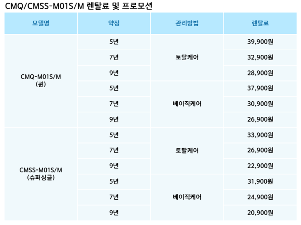 CMSS-M01,CMQ-M01 코웨이 [코웨이] 컴팩트 메모리폼 매트리스 (슈퍼싱글,퀸) 제품분류 매트리스 AS기간 렌탈기간내 최저 렌탈가 월 20,900 (렌탈가) 제휴카드 할인가 월 (렌탈가) 5년 7년 9년 슈퍼싱글 퀸 베이직케어 토탈케어 할인 제휴카드 보기 렌탈신청 장바구니