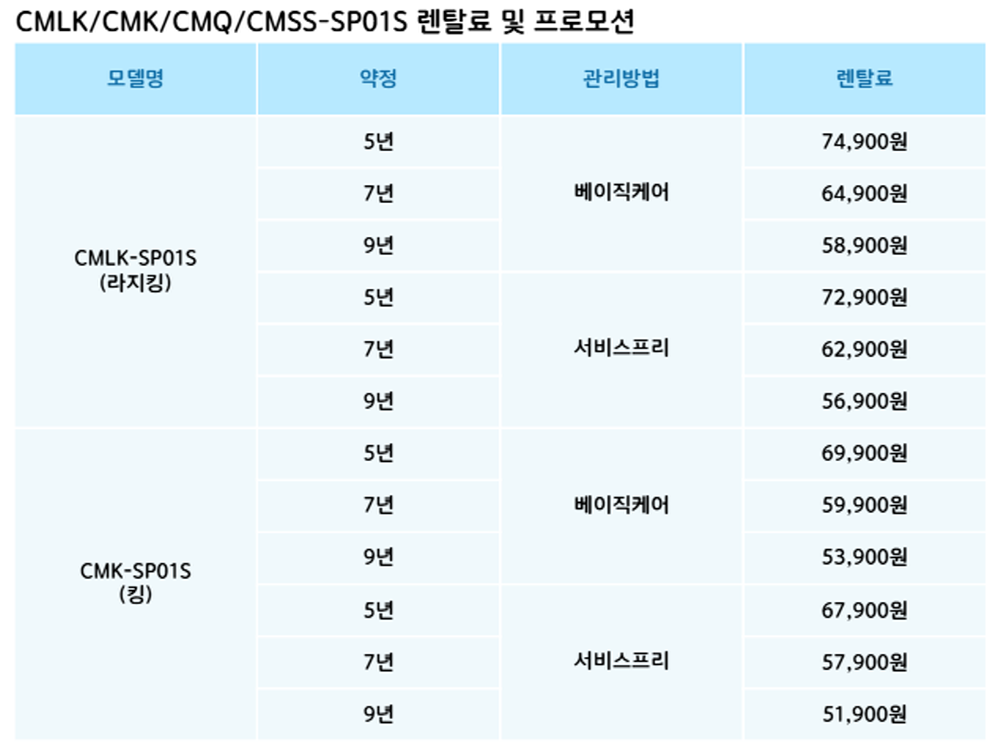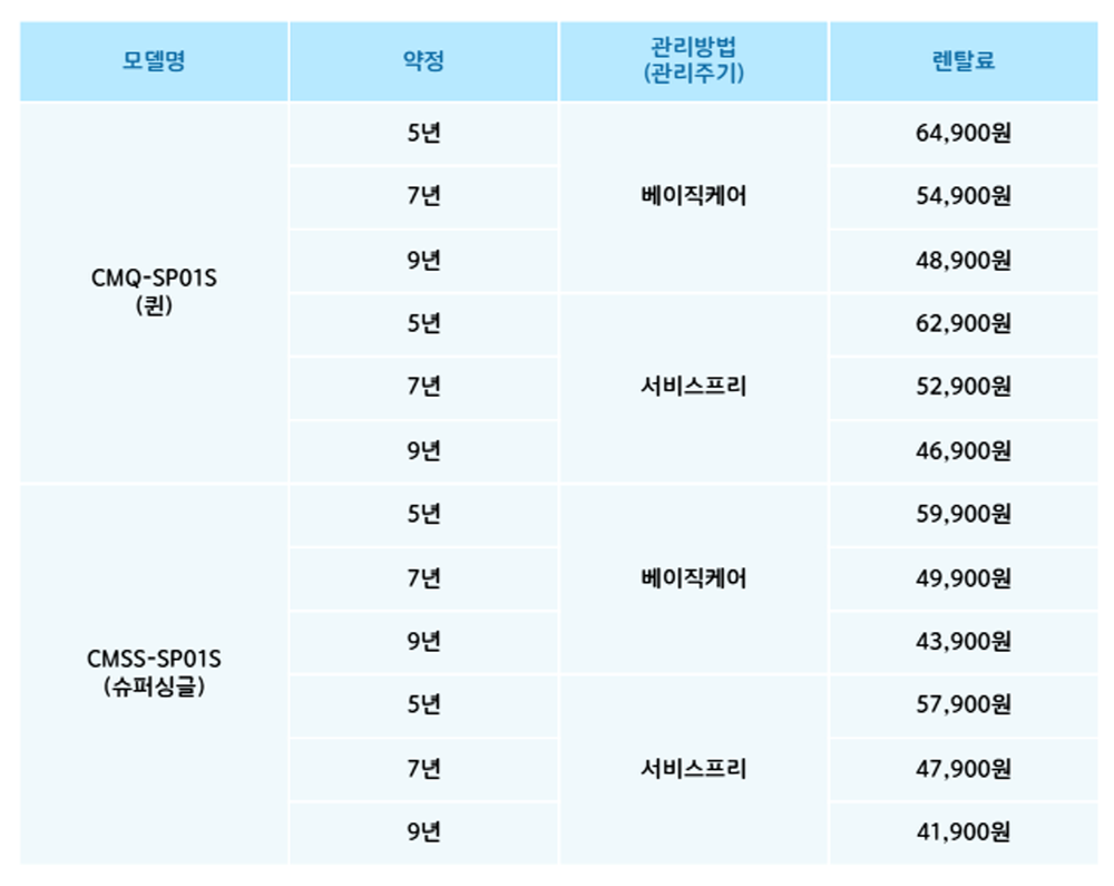 CMSS-SP01S,CMQ-SP01S,CMK-SP01S,CMLK-SP01S 코웨이 [코웨이] 비렉스 시그니처 매트리스 (슈퍼싱글,퀸,킹,라지킹) 제품분류 매트리스 AS기간 렌탈기간내 최저 렌탈가 월 41,900 (렌탈가) 제휴카드 할인가 월 (렌탈가) 5년 7년 9년 슈퍼싱글 퀸 킹 라지킹 서비스프리 베이직케어 할인 제휴카드 보기 렌탈신청 장바구니
