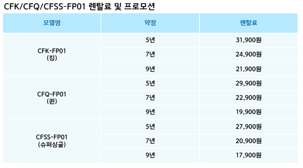 CFSS-FP01,CFQ-FP01,CFK-FP01 코웨이 [코웨이] 마이프레임 플랫헤드 기본형(슈퍼싱글,퀸,킹) 제품분류 침대 AS기간 렌탈기간내 최저 렌탈가 월 17,900 (렌탈가) 제휴카드 할인가 월 (렌탈가) 5년 7년 9년 슈퍼싱글 퀸 킹 제품색상 선택 민트그린 + 0원 오트밀베이지 + 0원 크림아이보리 + 0원 차콜그레이 + 0원 모카브라운 + 0원 할인 제휴카드 보기 렌탈신청 장바구니