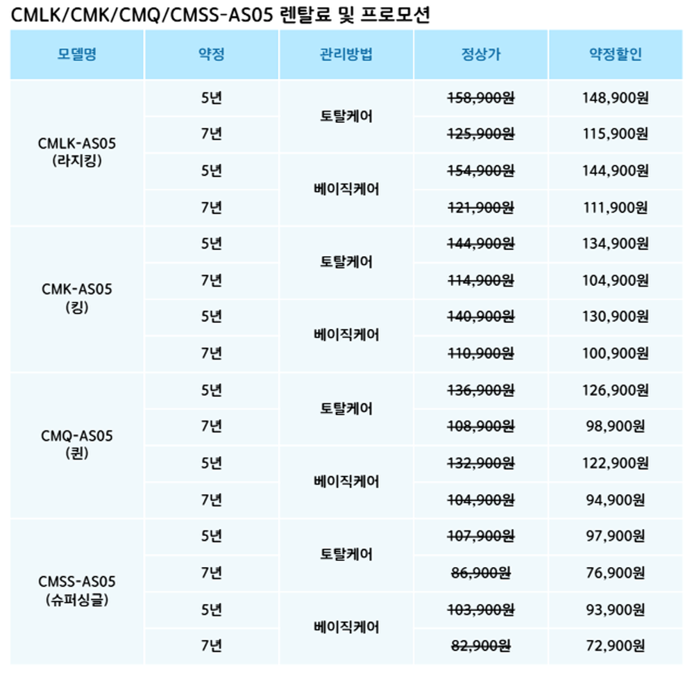 CMLK-AS05,CMK-AS05,CMQ-AS05,CMSS-AS05 코웨이 [코웨이] 비렉스 스마트 매트리스 S8+ 제품분류 매트리스 AS기간 렌탈기간내 최저 렌탈가 월 72,900 (렌탈가) 제휴카드 할인가 월 (렌탈가) 5년 7년 슈퍼싱글 퀸 킹 라지킹 베이직케어 토탈케어 제품색상 선택 네이비 + 0원 베이지 + 0원 할인 제휴카드 보기 렌탈신청 장바구니