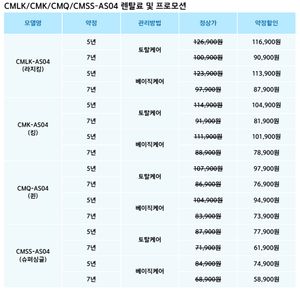 CMLK-AS04,CMK-AS04,CMQ-AS04,CMSS-AS04 코웨이 [코웨이] 비렉스 스마트 매트리스 S6+ 제품분류 매트리스 AS기간 렌탈기간내 최저 렌탈가 월 58,900 (렌탈가) 제휴카드 할인가 월 (렌탈가) 5년 7년 슈퍼싱글 퀸 킹 라지킹 베이직케어 토탈케어 제품색상 선택 네이비 + 0원 베이지 + 0원 할인 제휴카드 보기 렌탈신청 장바구니
