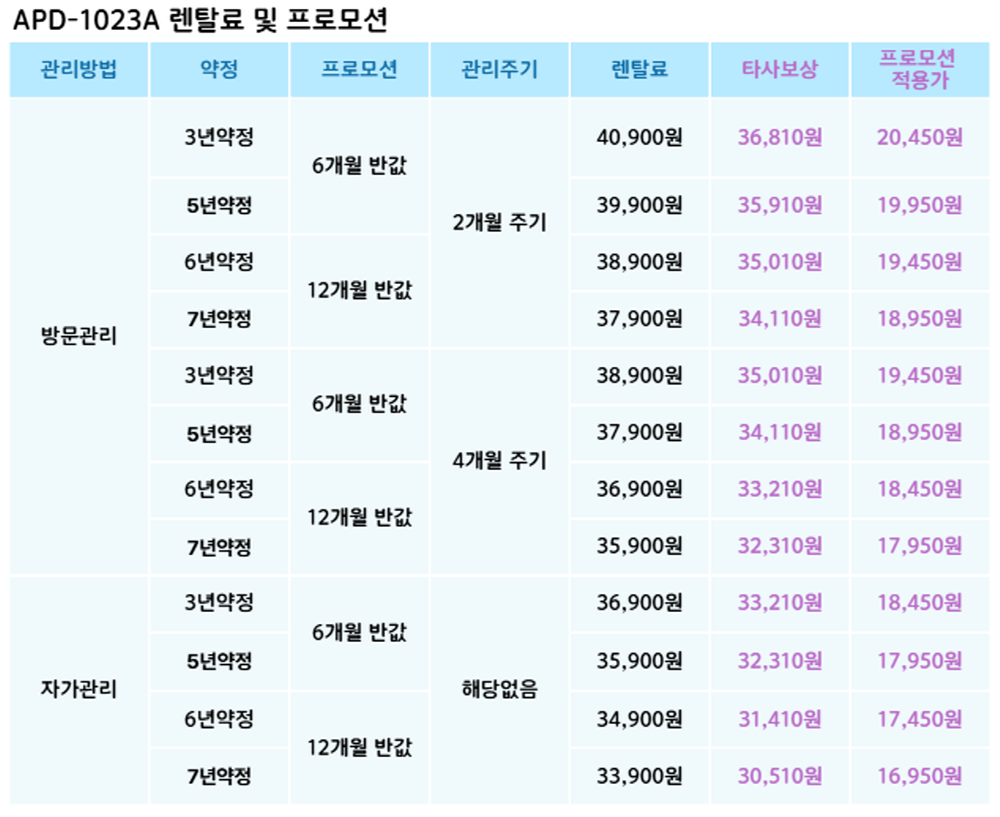 APD-1023A 코웨이 [코웨이] 듀어클린 제습 공기청정기 9평형 제품분류 청정기 기능 제습기능 AS기간 렌탈기간내 최저 렌탈가 월 33,900 (렌탈가) 제휴카드 할인가 월 (렌탈가) 3년 5년 6년 7년 자가관리 방문관리/4개월 방문관리/2개월 할인 제휴카드 보기 렌탈신청 장바구니