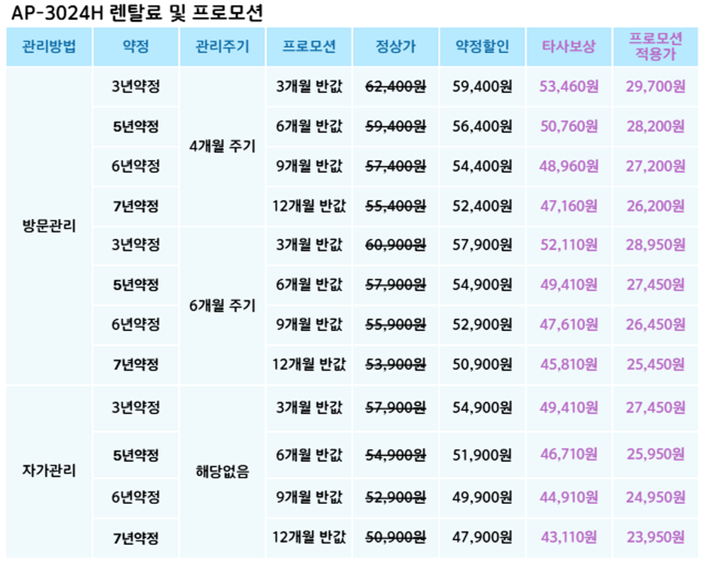 AP-3024H 코웨이 [코웨이] 노블 공기청정기2 30평형 제품분류 청정기 AS기간 렌탈기간내 최저 렌탈가 월 47,900 (렌탈가) 제휴카드 할인가 월 (렌탈가) 3년 5년 6년 7년 자가관리 방문관리/6개월 방문관리/4개월 제품색상 선택 포슬린화이트 + 0원 샌드베이지 + 0원 가든그레이 + 0원 임페리얼브라운 + 0원 페블그레이 + 0원 할인 제휴카드 보기 렌탈신청 장바구니